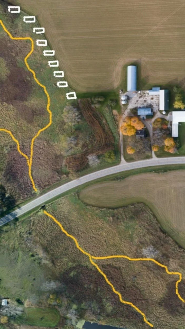 Meilahn Farms will introduce a collection of non-permanent eco-cabins overlooking the wetland in the spirit of sustainability and harmony with nature. These thoughtfully designed cabins, complimented with luxury appointments and housekeeping services, will blend seamlessly with the farm's ecosystem, offering guests a sanctuary amidst nature's splendor. The journey to each cabin is a scenic walk through the timeless farm, with vehicles left at the perimeter to maintain the serenity of the land. When mobility is essential, electric off-road golf carts stand ready, ensuring the farm’s ecosystem is undisturbed. This philosophy extends to every facet of life at Meilahn Farms, with the prohibition of hunting and fishing on the farm.
